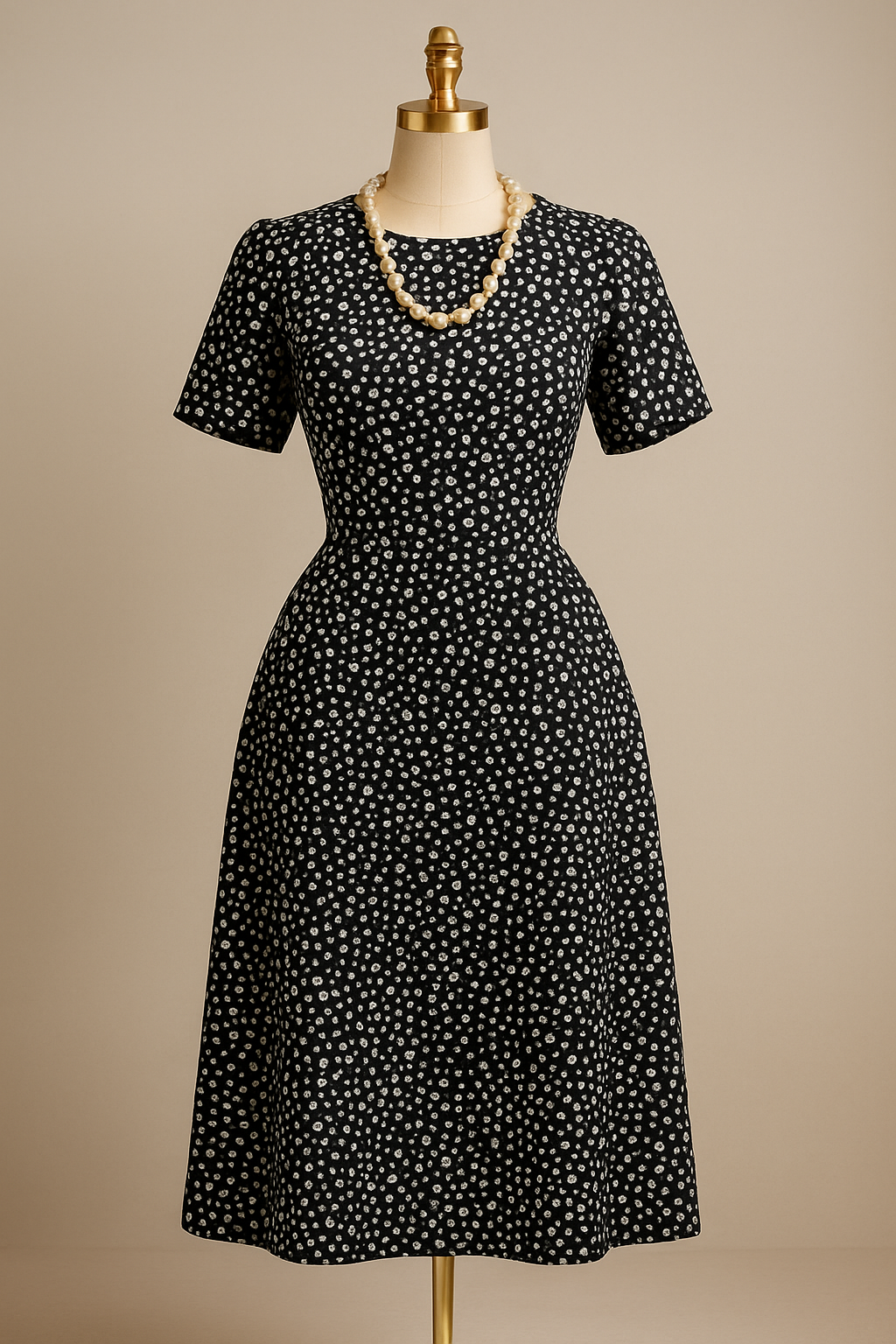 Black ditsy-floral fit-and-flare midi dress — short sleeves, crew neckline.