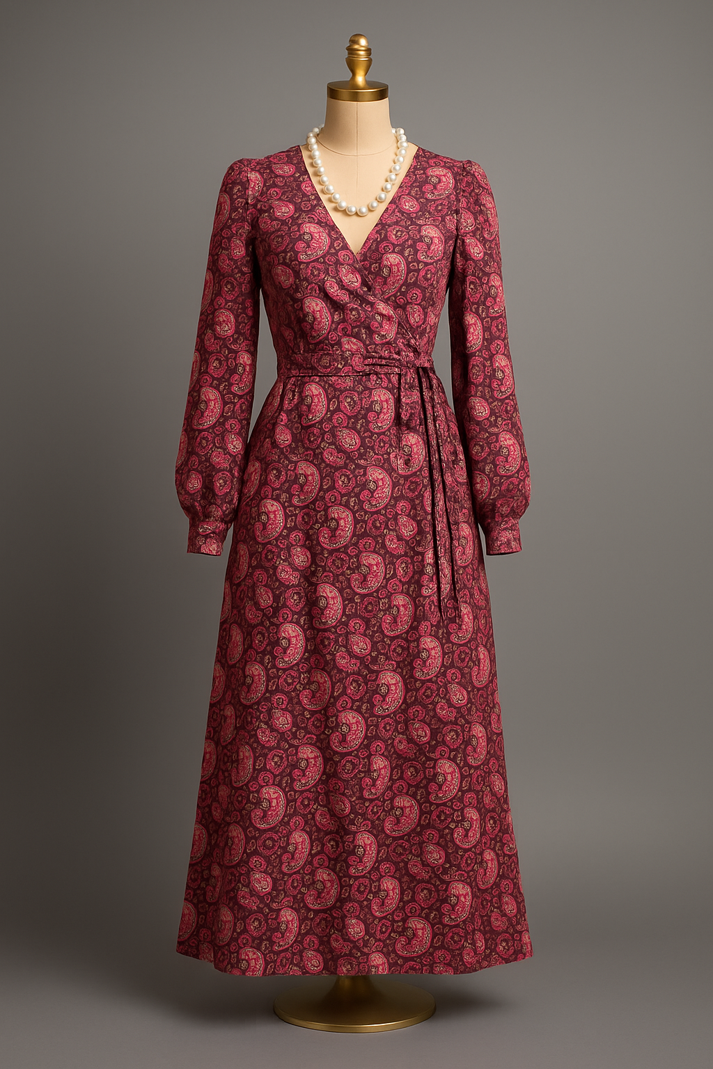 Burgundy paisley-print long-sleeve wrap maxi dress — V-neck with self-tie waist and A-line skirt.
