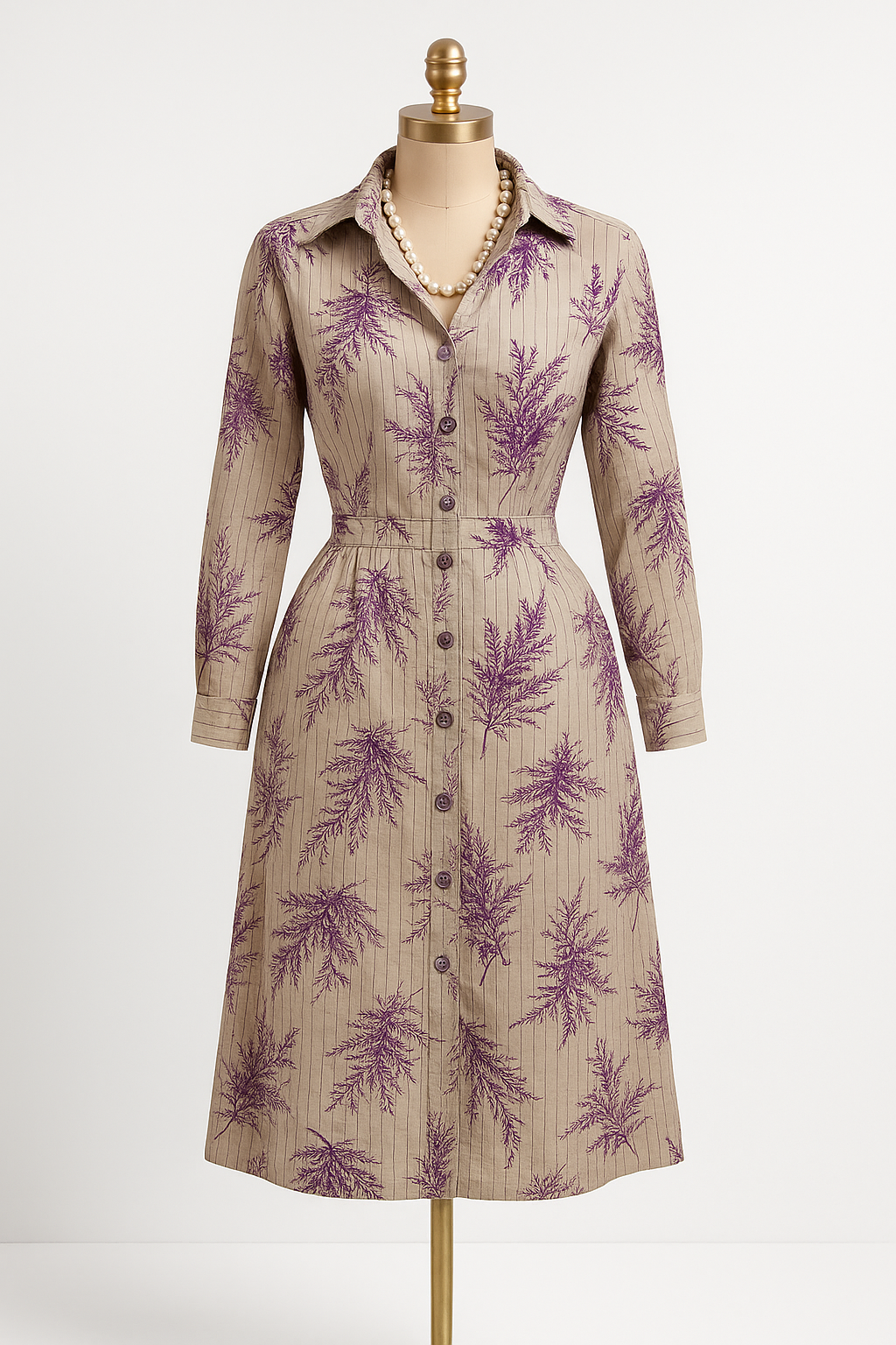 Long-sleeve leaf-print shirt dress (midi)