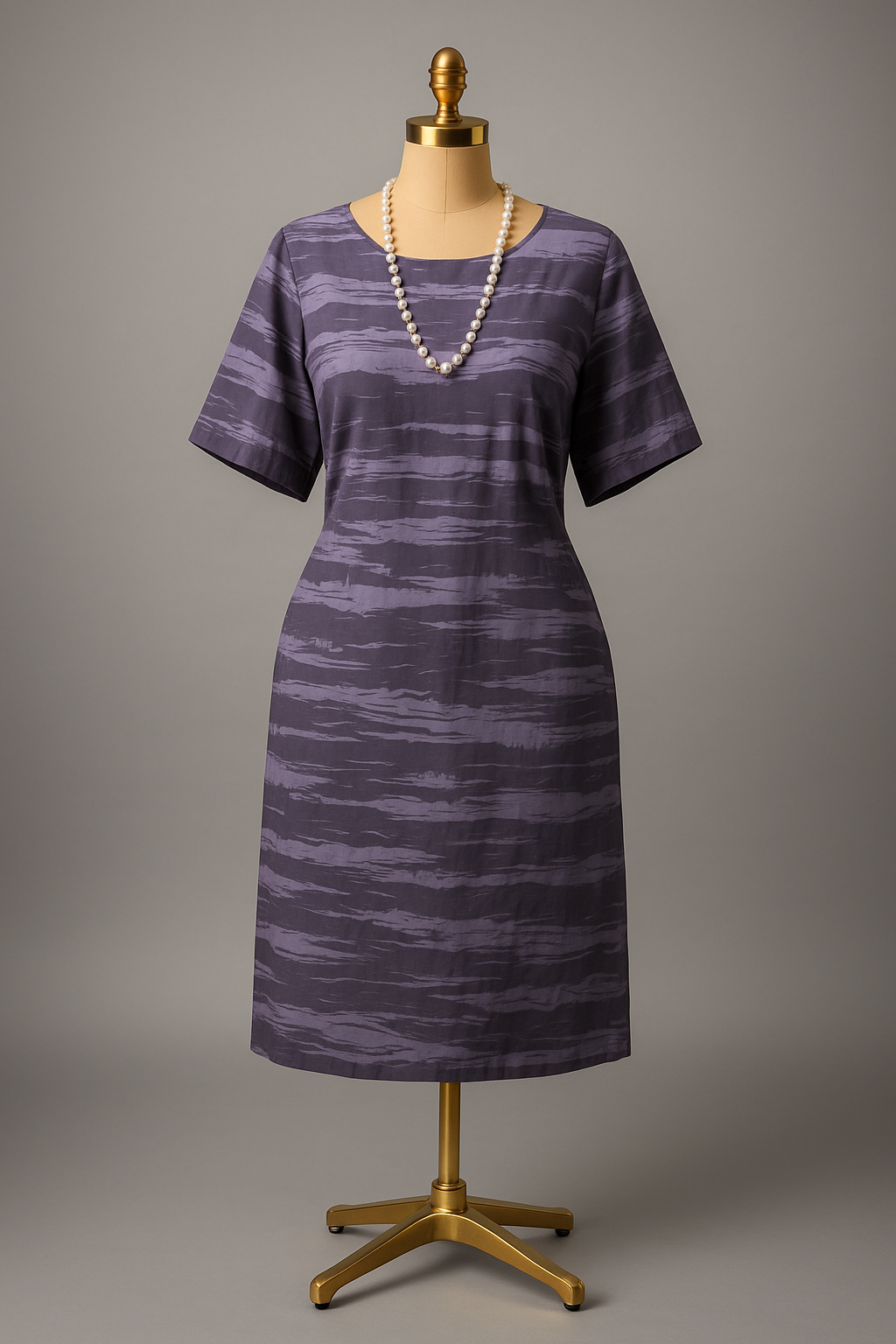 Slate-purple brushstroke stripe short-sleeve sheath/shift midi dress with a scoop neckline.